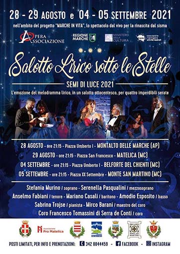 «Siamo orgogliosi che la prima tappa di questo ambizioso progetto del “Salotto Lirico Sotto le Stelle – Semi di Luce 2021” parta proprio da Montalto delle Marche. Un percorso in quattro serate – tra ripartenza, musica e arte – che la nostra città è felice di ospitare e inaugurare, con la convinzione che la ricostruzione post sisma passi anche dalla cultura e dall’impegno nel diffonderla e valorizzarla» sono queste le parole di Daniel Matricardi, sindaco di Montalto delle Marche. Le serate di “Salotto Lirico sotto le Stelle – semi di Luce 2021” saranno ambientate all’interno di un salotto ottocentesco allestito sui palcoscenici posizionati nelle piazze dei comuni ospitanti che fanno da cornice. Artisti professionisti di fama nazionale e internazionale – il soprano Stefania Murino, il mezzosoprano Serenella Pasqualini, il tenore Anselmo Fabiani, il baritono Mariano Casali, il basso Amodio Esposito – canteranno le più belle arie del melodramma lirico, affiancati dal coro di trenta componenti – il Coro Francesco Tomassini di Serra de Conti, diretto dal maestro Mirco Barani – e accompagnati dalla pianista Sabrina Trojse, che, come gli altri artisti citati, ha calcato i palcoscenici più prestigiosi del mondo.