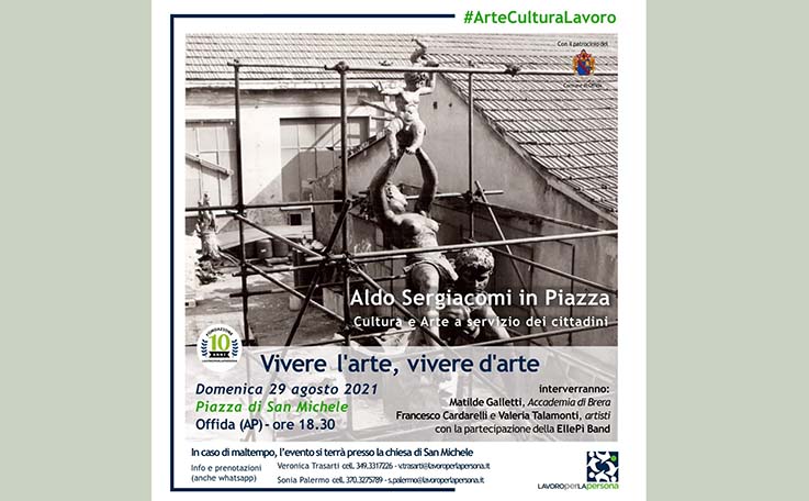 OFFIDA – L’arte può essere strumento di “salvezza” per i territori e per le persone che li abitano? Come valorizzare i giovani artisti per fare in modo che si possa non solo vivere l’arte, ma anche vivere d’arte? La Fondazione Lavoroperlapersona organizza una serata dedicata allo scultore offidano Aldo Sergiacomi, in compagnia della musica della EllePì Band, delle riflessioni di Matilde Galletti (Accademia di Brera) e delle opere di Francesco Cardarelli, artista visuale offidano e Valeria Talamonti, artista di San Benedetto del Tronto. Appuntamento in Piazza San Michele, domenica 29 agosto a Offida, a partire dalle ore 18,30. In caso di maltempo l’evento si terrà presso la Chiesa di San Michele. «Un’iniziativa importante – commenta l’assessore Isabella Bosano – perché si ricorda così un grande scultore offidano». Con “Aldo Sergiacomi in Piazza” la Fondazione Lavoroperlapersona prosegue un originale percorso educativo, per dare possibilità di ascoltare, conoscere e fare esperienza diretta con il linguaggio dell’arte e del territorio. Il programma rappresenta un’occasione senza eguali per accrescere conoscenza e sensibilità: una serata estiva differente e ad alta intensità emotiva in uno dei borghi più belli d’Italia. L’occasione per queste lezioni d’arte, a servizio di una nuova generazione di cittadini, è ispirata dal ricordo della vita e delle opere dello scultore offidano Aldo Sergiacomi, queste ultime ospitate nel Museo Aldo Sergiacomi (www.museosergiacomi.it), trasformato ora in Laboratori didattici e sede della Fondazione Lavoroperlapersona.