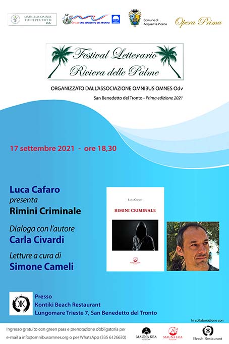 SAN BENEDETTO DEL TRONTO – Nuovo appuntamento del Festival Letterario Riviera delle Palme organizzato dalla Omnibus Omnes, con Patrocinio dei Comuni di San Benedetto del Tronto e di Acquaviva Picena. È il penultimo del ciclo estivo del Festival, alla sua prima edizione.        L’appuntamento del 17 settembre, alle ore 18.30 presso lo Chalet Kontiki sul Lungomare di San Benedetto, è con la presentazione del thriller “Rimini criminale” di Luca Cafaro, edito dalla casa editrice sambenedettese Mauna Loa Edizioni. Cafaro è laureato in Scienze Motorie e vive e insegna a Rimini. Il suo è un thriller avvincente, dal finale mozzafiato: una serie di crimini, apparentemente non collegati tra loro, dilaga tra le strade cittadine e le campagne di Rimini. Per il vicequestore Lombardi e la sua squadra è una matassa davvero difficile da sbrogliare. Nonostante l’ambientazione noir, Cafaro offre un romanzo dai risvolti umani e toccanti, un “giallo-rosa”, dove i personaggi vivono una intensa umanità. Dice Luca Cafaro: «Sono molto lieto di questo evento al Festival: a causa della pandemia, ho dovuto rimandare la presentazione ufficiale».  A presentare sarà Carla Civardi, letture a cura di Simone Cameli. Obbligatori la prenotazione presso la Omnibus Omnes (whatsapp 3356126630) e il Green Pass. Il 24 settembre si chiuderà il ciclo del Festival con Giancarlo Trapanese, che presenterà il suo ultimo libro “73 anni e 1 giorno”.