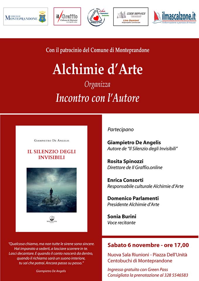 MONTEPRANDONE – Nuovo evento organizzato da Alchimie d’Arte a Centobuchi con il Patrocinio del Comune di Monteprandone: sabato 6 novembre alle ore 17, presso la nuova Sala Riunioni in Piazza dell’Unità, Giampietro De Angelis presenterà il suo romanzo “Il silenzio degli invisibili” (Mauna Loa Edizioni). Giampietro De Angelis è uno scrittore che nutre interesse, da appassionato ed hobbista, anche per altre forme artistiche ed espressive, dalle arti figurative al teatro. Al suo attivo, ha la raccolta di brevi racconti e poesie “All’ombra del punto”, collabora con la testata giornalistica Il Graffio.online dove cura la rubrica “Vuoti & Pieni”, e ha scritto la prefazione, per Mauna Kea, nell’ambito della collana ad alta leggibilità Easy Reader, di “Le avventure di Pinocchio” di Collodi, “Le mie prigioni” di Silvio Pellico, “La novella del buon vecchio e della bella fanciulla e altri racconti” di Italo Svevo. È membro fondatore di Omnibus Omnes, associazione che si occupa di tematiche sociali, diritti umani e cultura dei popoli indigeni. Il romanzo di Giampietro De Angelis “Il silenzio degli invisibili” è un romanzo autobiografico, intimista, dove il protagonista ci fa rivivere i mitici anni ’60 visti da un ragazzo introverso e mite che si sente “invisibile” agli altri, mentre intorno a lui esplodeva la contestazione studentesca, la musica rock, il Festival di Woodstock. Testimone anche lui di evoluzioni e rivoluzioni di costumi che hanno segnato la fine di un epopea storica da dimenticare, per crearne un altra futuristica, indelebile a misura di uomo e incredibilmente ancora attuale. Per partecipare all’incontro è consigliabile la prenotazione al numero 3285546583. Ingresso gratuito con il Green Pass.