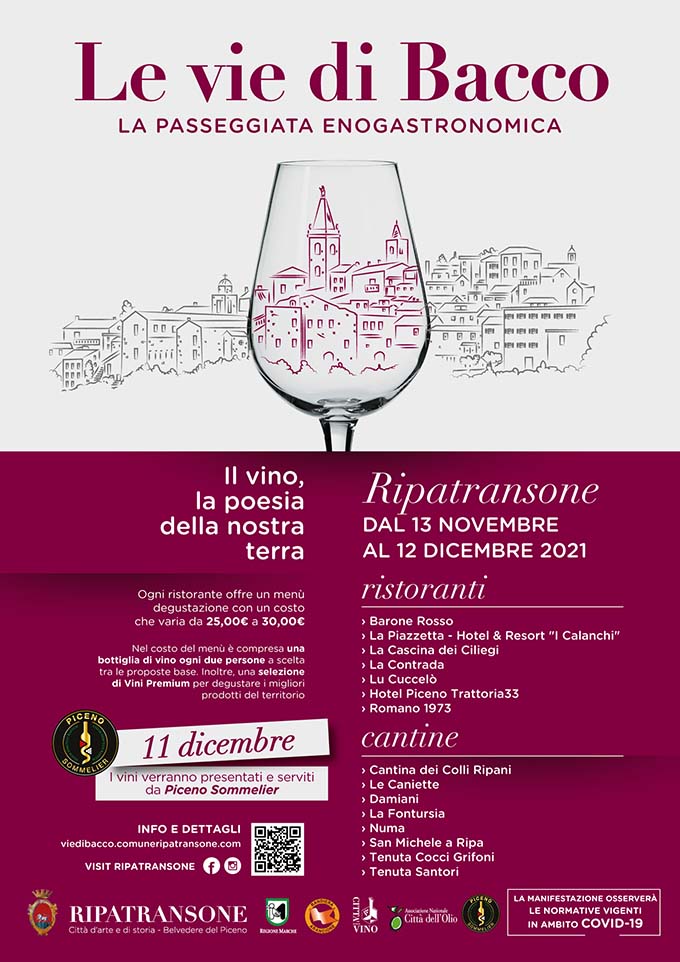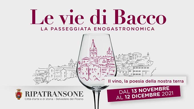 RIPATRANSONE – Con l’autunno Ripatransone torna ad essere percorsa sulle Vie di Bacco. Prende il via dal 13 novembre e fino al 12 dicembre 2021 la storica iniziativa di promozione delle eccellenze enogastronomiche ripane e picene proposte dai Ristoratori e dalle Cantine Vitivinicole della Città. La manifestazione, promossa dall’Amministrazione Comunale di Ripatransone, torna a calendario dopo l’interruzione del 2020 dovuta alla pandemia. L’iniziativa, giunta alla sua 26ª edizione, vede anche per il 2021 uno straordinario coinvolgimento delle realtà cittadine e sarà vetrina dei migliori prodotti del territorio. La formula prevede la proposta di menù degustazione ad un prezzo compreso tra 25 euro e 30 euro a persona; tali menù includono una bottiglia di vino ogni due persone tra le proposte base delle Cantine Ripane aderenti. Inoltre, una selezione di Vini Premium, per degustare i migliori prodotti del territorio. Le etichette saranno quindi contenute nella Carta dei Vini Ripani, la lista di tutti i vini presentati dalle cantine locali. In ciascun menù verrà proposto un piatto tipico del patrimonio gastronomico ripano.