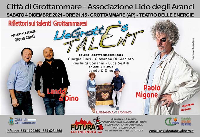 GROTTAMMARE – Sabato 4 dicembre alle ore 21.15, al Teatro delle Energie di Grottammare, ritorna l’appuntamento con “Lle Grotte’s Talent”, riflettori puntati sui talenti grottammaresi. Il format presentato dalla showgirl Gloria Conti, che darà dimostrazione tra l’altro delle sue ottime doti canore, avrà come ospite d’onore direttamente dal “Nuovo Zelig” Paolo Migone e il suo esilarante spettacolo. Altra grande sorpresa, sarà l’esibizione di Lando e Dino con le loro micidiali barzellette, premiati inoltre come Talenti Vip Regionali. Ecco i quattro Talenti Grottammaresi che saliranno sul palco: Pierluigi Bonanni, giovane e talentuoso pianista con grandi doti artistiche. Suona come tastierista nella band “La fabbrica del ghiaccio”, e come pianista nel duo piano-voce “Appendice”. Con il suo gruppo ha aperto spesse volte i concerti della band Caro De André che vede come frontman suo padre, il bravissimo Carlo Bonanni: buon sangue non mente!