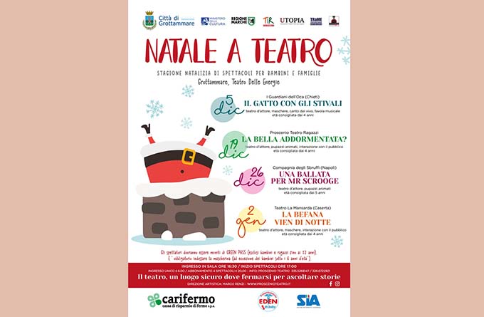 GROTTAMMARE – Sarà un “Natale a Teatro” per bambini e famiglie quello in programma al Teatro delle Energie per le festività di fine anno. Quattro appuntamenti domenicali, dal 5 dicembre al 2 gennaio, con classici della letteratura per l’infanzia: storie indimenticabili come “Il Gatto con gli stivali” o “La bella addormentata nel bosco” reinterpretati da compagnie di lunga esperienza nell’ intrattenimento dei più piccoli. Gli spettacoli avranno inizio alle ore 17. L’iniziativa, promossa da “Proscenio Teatro”, per la direzione artistica di Marco Renzi, fa parte di un progetto molto ampio, TIR-TEATRI IN RETE, che coinvolge e mette in rete otto Comuni nelle Province di Macerata (Civitanova Marche, Monte San Giusto, Treia), Fermo (Fermo, Montegranaro, Montegiorgio, Porto San Giorgio), Ascoli Piceno (Grottammare), per quello che è il più grande e longevo circuito di teatro per l’infanzia e la gioventù nella parte sud della Regione Marche.