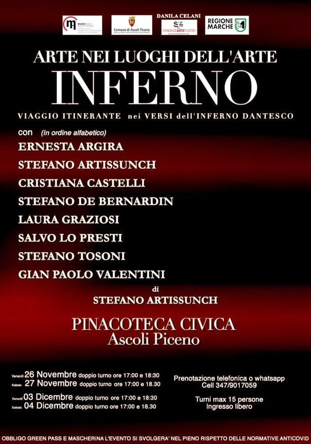 ASCOLI PICENO – Synergie Arte Teatro, in collaborazione con Regione Marche, Comune di Ascoli Piceno e Musei Civici, propone una suggestiva performance-spettacolo sull’Inferno Dantesco. Lo spettacolo, realizzato con la regia di Stefano Artissunch, vede alternarsi nella declamazione dei meravigliosi versi dell’Inferno attori professionisti marchigiani, in ordine alfabetico: Ernesta Argira, Stefano Artissunch, Cristiana Castelli, Stefano De Bernardin, Laura Graziosi, Salvo Lo Presti, Stefano Tosoni e Gian Paolo Valentini. Gli eventi si svolgeranno nella Civica Pinacoteca di Ascoli Piceno nei giorni 26-27 novembre e 03-04 dicembre. Per garantire la miglior riuscita rispettando i luoghi della Pinacoteca ed il contingentamento del pubblico si organizzeranno, per ogni giornata di spettacolo, due performance, la prima con inizio alle ore 17 e la seconda con inizio alle ore 18.30. L’ingresso è libero su prenotazione al numero telefonico 347.9017059 (anche Whatsapp). Per ogni turno si prevedono max 15 persone. Obbligo green pass e mascherina. «La proposta culturale della nostra città è sempre più qualificata e raffinata, ed emerge da un tessuto sociale ricco di talenti come è quello ascolano. Una caratteristica che pone Ascoli Piceno in primo piano nel panorama culturale italiano» ha dichiarato il sindaco Marco Fioravanti. «Sono molto soddisfatta delle attività della rete museale, che quest’anno hanno registrato un numero elevatissimo di visitatori. Questa iniziativa, che celebra i 700 anni dalla morte di Dante, va ad aggiungersi alle numerose altre che si sono susseguite nel corso dell’anno, segnalandosi per l’originalità della contaminazione artistica» ha aggiunto l’assessore alla cultura Donatella Ferretti.