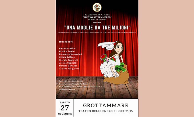 Non si può allora perdere l’ultimo appuntamento previsto per questo 2021, sabato 27 novembre, alle ore 21.15 sempre al Teatro delle Energie di Grottammare con il Gruppo Teatrale “Nuovo Settemmezzo” di Ripatransone e “Una moglie da tre milioni” di Giuseppe Braconi e liberamente adattata in dialetto ripano da Giorgio Cardarelli. Ecco il cast: Carlo Piergallini, Cristina Paolini, Francesco Vespasiani, Chiara Buffone, Giorgio Cardarelli, Alessia Capriotti, Daniele Monopoli e Arianna Pasqualini. Una commedia ricca di colpi di scena. La storia ruota intorno a Felice, eterno scapolo, viziato e coccolato dalla zia e sempre in combutta con l’amico Achille. A mettere in discussione i suoi “sani” principi sarà Ninetta con la sua misteriosa eredità. Riuscirà la dolce ragazza a sconfiggere i pregiudizi dell’impenitente sciupafemmine?