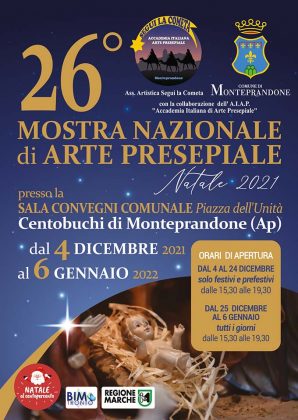 MONTEPRANDONE – Apre la 26esima Mostra Nazionale di Arte Presepiale di Monteprandone curata dall’associazione Segui la Cometa, presso la nuova Sala Riunioni in Piazza dell’Unità a Centobuchi, nell’ambito delle iniziative del Natale al Centopercento.  Apertura al pubblico a partire da domenica 5 dicembre, alle ore 15:30 con i seguenti giorni e orari: dal 5 dicembre al 24 dicembre 2021 solo festivi e prefestivi, dalle ore 15:30 alle ore 19:30 e dal 25 dicembre 2021 fino al 6 gennaio 2022, tutti giorni dalle ore 15:30 alle ore 19:30. Sarà possibile ammirare oltre 60 opere di artisti fra i più famosi d’Italia, provenienti da ogni regione, presenti con opere di livello internazionale che lasceranno un indelebile ed emozionante ricordo nei visitatori amanti di questa arte e non. Sono previste visite guidate con esperti a disposizione del pubblico appartenenti all’Accademia Italiana di Arte Presepiale di Monteprandone del Maestro Giovanni Rosati, unica scuola di questa arte presente nel nostro territorio ed unico esempio di scuola Presepistica insieme al Laboratorio Presepistici Sant’Anna di Valmontone.