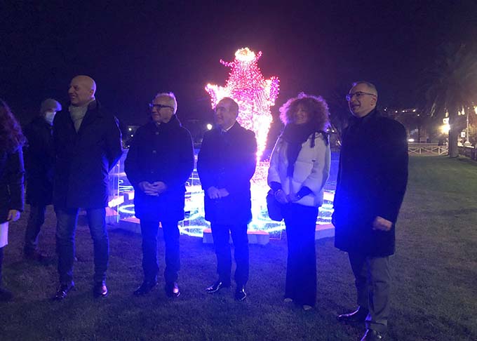 SAN BENEDETTO DEL TRONTO – Nella sera di mercoledì 8 dicembre sono state accese le installazioni artistiche nel Giardino “Nuttate de lune” a San Benedetto del Tronto, alla presenza del sindaco Antonio Spazzafumo, dell’assessore all’urbanistica Bruno Gabrielli e del presidente della Fainplast Battista Faraotti. Due installazioni artistiche che impreziosiranno per il periodo natalizio l’area verde della città e che, nei giorni scorsi, hanno fatto la loro apparizione, grazie al lavoro degli operatori della Pellegrini Giardini di Civitanova Marche, nel suggestivo Giardino “Nuttate de lune”, sono dovute alla generosità e all’impegno dell’azienda Fainplast che da anni è vicina alla città di San Benedetto del Tronto e al territorio piceno.
