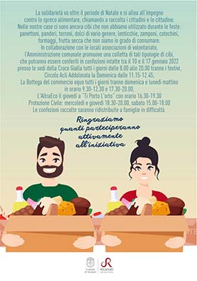 Durante il periodo natalizio i pranzi e le cene si moltiplicano, momenti di condivisione in famiglia e tra amici che  al contempo  rappresentano anche una possibilità di notevoli sprechi alimentari. Nelle nostre case ci sono ancora numerosi generi alimentari che non sono stati utilizzati  tra cui panettoni, torroni, dolci di vario tipo,  lenticchie e altri legumi, zamponi, formaggi e frutta secca, cibi  che non sono stati consumati, pertanto  il Comune, in collaborazione con le principali associazioni di volontariato e grazie al loro impegno, promuove una campagna di raccolta di  alimenti  a favore di famiglie in difficoltà.