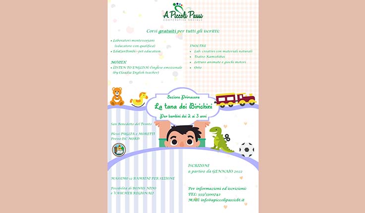 SAN BENEDETTO DEL TRONTO – Le Sezioni Primavera della Cooperativa “A piccoli passi”, sono presenti presso la Scuola dell’infanzia Moretti e la scuola dell’infanzia di via Puglia (Isc Nord). Possono accogliere solo 12 bambini per sezione, dai 2 ai 3 anni di età. «In questo particolare e delicato periodo, la caratteristica del piccolo gruppo, è a maggior ragione uno degli aspetti principali di qualità del servizio, così come il rapporto educatrici/bambini (3 per 12 bambini) e la presenza di solo personale qualificato tra psicologhe, pedagogiste ed educatrici professionali. – fanno sapere dalla Cooperativa – A tali aspetti se ne affiancano altri come l’accesso a corsi gratuiti, per tutti gli iscritti, fra cui il nuovo corso di inglese emozionale, con insegnante madrelingua, laboratori Montessori e letture animate con giochi motori ed attività con i cani (pet education). Tali corsi verranno affiancati da altre attività quali orto, laboratori creativi con materiale naturale e teatro Kamishibai. Il servizio si avvale inoltre del Bonus Nido Inps. Le iscrizioni sono già aperte ed andranno avanti fino ad esaurimento dei posti disponibili. Per maggiori informazioni è possibile contattare il 333/3300742.