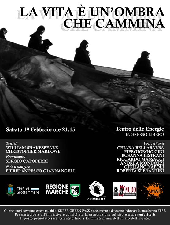 GROTTAMMARE – Per il cartellone “Sisto V e il suo tempo”, il Laboratorio Teatrale Re Nudo, sabato 19 febbraio alle ore 21.15, porta al Teatro delle Energie un recital tratto dalle tragedie più note di autori elisabettiani come William Shaklesperare e Christopher Marlowe. “La vita è un’ombra che cammina” è il titolo della rappresentazione che si avvale del contributo musicale del fisarmonicista Sergio Capoferri, con note a margine di Pierfrancesco Giannangeli. Il recital consentirà di ascoltare brani tratti dal Riccardo III, Giulio Cesare, Macbeth, Otello, Faust, opere di autori che grazie alle loro riflessioni immortali sull’amore, sul potere, sulla corruzione, sono riusciti ad andare fuori dal loro tempo e dal loro spazio ed essere ancora oggi profondamente attuali. Alcuni loro personaggi, sempre pronti a tradire per il proprio tornaconto e animati da una sete infinita di potere, parlano ancora all’oggi, in cui i valori di lealtà e giustizia sembrano ormai quasi un’utopia. Voci recitanti: Chiara Bellabarba, Piergiorgio Cinì, Rosanna Listrani, Riccardo Massacci, Andrea Mondozzi, Giuliano Napoli, Roberta Sperantini. Il programma “Sisto V e il suo tempo”, è sostenuto da Regione Marche, Città di Grottammare e Amat. La partecipazione allo spettacolo è gratuita. Gli spettatori dovranno attenersi alle norme anti Covid: super green pass, documento di identità e mascherina Ffp2. Prenotazione consigliata sul sito www.eventbrite.it.