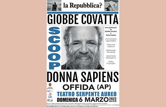 OFFIDA – Giobbe Covatta in scena domenica 6 marzo alle ore 21.15 al Teatro Serpente Aureo, con l’anteprima di “Scoop: Donna Sapiens”, che porterà a Roma il prossimo 8 marzo. Il nuovo spettacolo del comico, scritto con Paola Catella, vuole dimostrare, grazie a un linguaggio irriverente e dissacratorio, la superiorità della donna sull’uomo. «Per convalidare tale tesi – riporta la trama – Covatta spazia dalla storia, alla sociologia, alla medicina e da ogni punto di vista il maschio della razza umana esce perdente e ridicolo rispetto alla donna. Non mancano interviste impossibili con personaggi importanti che supportano tale tesi: a partire da Dio stesso, che svela gli esilaranti retroscena della creazione, fino a un improbabile uomo del futuro che ci mette in guardia sui rischi di un mondo assoggettato all’arroganza maschile, passando per Nello, il povero membro maschile che chiede aiuto per le sue pessime condizioni di vita, schiavo dei ridicoli appetiti sessuali del suo padrone. Covatta dimostra nel suo modo comico e surreale il proprio amore e rispetto per le donne, a cui dedica in finale un poetico omaggio».