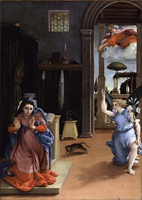 L’incontro tra Maria e l’arcangelo Gabriele nel piccolo borgo di Nazareth, destinato a cambiare completamente le sorti dell’umanità, viene rappresentato nel capolavoro recanatese in maniera insolita rispetto alla tradizione. Lorenzo Lotto sceglie di far emergere sulla tela le emozioni della Vergine: lo smarrimento provato da Maria all’annuncio dell’Angelo è reso evidente dallo sguardo e dai gestimentre il gatto, simbolo del male che fugge alla presenza divina, si allontana spaventato.