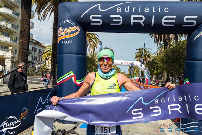 Per quanto riguarda il Duathlon Sprint, prima tappa ad assegnare punti per il rank del circuito Adriatic Series, si sono assicurati la vittoria, entrambi con ampio margine, Gloria Cisotto (Triathlon Cremona Stradivari) e Mattia Ceccarelli (Overcome). Sul podio con Cisotto sono salite al termine di una bella lotta Maya Brunetti (Forum Sport Center) e Marina Coccia, la portacolori del team organizzatore che si è anche laureata campionessa regionale di specialità. Ceccarelli, grande triatleta specialista del triathlon long distance e delle gare con bici senza scia, dopo una prima frazione corsa nel gruppo di testa in maniera accorta, in sella ha aperto il gas ed è scappato via in solitaria, guadagnando un vantaggio più che consistente sui suoi avversari, consolidato poi nell’ultima frazione. Il podio è stato completato da due giovani talenti che hanno dato tutto fino all’ultimo metro: l’ha spuntata Lorenzo D’Altri (Raschiani Triathlon) davanti a Niccolò Sancisi (Dinamo Triathlon Pesaro) che ha conquistato anche la maglia di campione marchigiano.