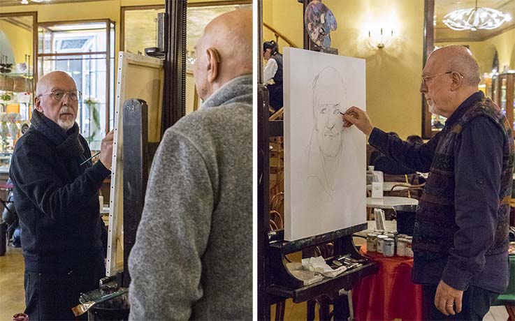 Il pittore lo scelse per due volte, nel 2005 e nel 2018, per effettuare dal vivo, appunto, con straordinaria maestria, ritratti di tanti personaggi della città, ognuno profondamente radicato nel quotidiano. Nel 2005, ad esempio, tra i tanti, mise su tela l’avvocato Giangiacomo Lattanzi, principe del foro e politico di primo piano, e Luigi Paracciani, ambientalista estremo ed espressione di un’anima popolare oggi svanita. Nel 2018 volle ripetere l’esperienza con “L’ora del ritratto” organizzata dal Circolo Acli “Achille Grandi”, guidato da Lanfranco Norcini Pala. Anche in questa occasione colse il volto e l’anima di personaggi, più o meno noti, ma tutti con una storia personale da fissare: Massimiliano Ossini, Giuseppe Piccioni, Vittorio Vitelli, Giuliano Giuliani, Luigi Morganti, Furio Cappelli, Franco De Marco, Enzo Marinelli, Lucio Sestili, Innocenzo Prezzavento, Carmelita Galiè, Cecilia Giovannozzi “la macellara  mogghie de Paccò” o Maria Pia Valentini Tranquilli, titolare dello storico “Lu furne de Ustì” (come titolò sulla tela).