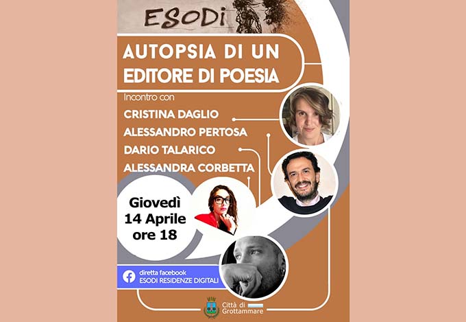 GROTTAMMARE – Per “Esodi. Residenze digitali” un altro giovedì con la poesia: ospiti di oggi, giovedì 14 aprile, saranno Dario Talarico, Alessandra Corbetta, Alessandro Pertosa e Cristina Daglio per l’incontro dal titolo “Autopsia di un editore di poesia”. Appuntamento alle 18 sulle pagine Facebook di “Esodi residenze digitali” o “Città di Grottammare”. La rassegna nata sulla piattaforma digitale come luogo di dialogo aperto alle nuove forme di espressione della contemporaneità presenta questa volta il progetto Puntoacapo Editrice, avviato nel maggio 2008 sulla scorta dell’entusiasmo e della creatività di Cristina Daglio, dell’esperienza in campo editoriale e letterario di Mauro Ferrari e di uno staff di collaboratori autorevoli e motivati. «Lo scopo era ed è – afferma il coordinatore della rassegna Lucilio Santoni – quello di costruire un progetto innovativo e di grande impegno finalizzato alla costruzione di un Catalogo che si imponesse come approdo prestigioso per le voci poetiche più significative della contemporaneità. Puntoacapo promuove la cultura e la poesia attraverso pubblicazioni, incontri, letture in sinergia con altre forme artistiche, rappresentando quanto di meglio urge nel campo della composizione in versi, senza limitazioni di lingue e cultura». Tutte le puntate della rassegna sono sempre disponibili alle pagine Facebook  “Esodi residenze digitali” o “Città di Grottammare”.