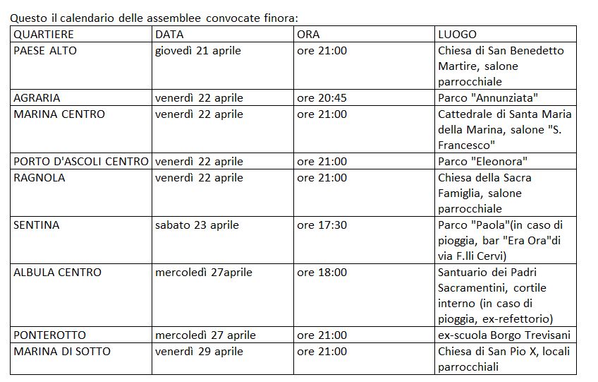 SAN BENEDETTO DEL TRONTO –  I quartieri Agraria, Albula Centro, Marina Centro, Marina Di Sotto, Paese Alto, Ponterotto, Porto D’Ascoli Centro, Ragnola e Sentina apriranno nella prossima settimane, tra mercoledì 20 e venerdì 22 aprile, il ciclo di assemblee dei residenti che dovranno definire le modalità con cui i cittadini esprimeranno il loro voto per il rinnovo dei Consigli direttivi previsto per il 4 e 5 giugno 2022.