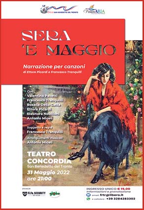 SAN BENEDETTO DEL TRONTO – Quando due menti vivaci, colte e illuminate s’incontrano per far sì che un’idea prenda vita, allora il progetto che ne scaturisce non può essere altro che originale e degno della massima attenzione. Se poi le due menti in questione sono quelle poliedriche di Francesco Tranquilli (professore, attore, regista, scrittore) ed Ettore Picardi (procuratore della Repubblica di Teramo, poeta e scrittore), allora il risultato non può che essere eccellente. In altre parole – Signore e Signori! – ecco a voi “Sera ‘e maggio”, narrazione per canzoni di Ettore Picardi e Francesco Tranquilli con Valentina Pacetti (Reginella / Bammenella/Anna), Francesco Tranquilli (Edoardo), Rosalia Della Gatta (Partenope), Ettore Picardi (‘o Munaciello), Eleonora Nobilioni, flauto (La Ninfa Naiade), Antonio Miceli, chitarra (‘o Maestro ‘e Chitarra). Soggetto e regia di Francesco Tranquilli, arrangiamenti musicali di Antonio Miceli. Lo spettacolo, organizzato dall’Associazione MultiCulturale VisionAria in coproduzione con il Comune di San Benedetto del Tronto, andrà in scena martedì 31 maggio alle ore 21 al Teatro Concordia e segue le vicende di una coppia nella Napoli di inizio secolo scorso attraverso le canzoni più famose del repertorio classico, narrate e commentate da due personaggi tradizionali dell’immaginario partenopeo come ‘o Munaciello e la sirena Partenope.
