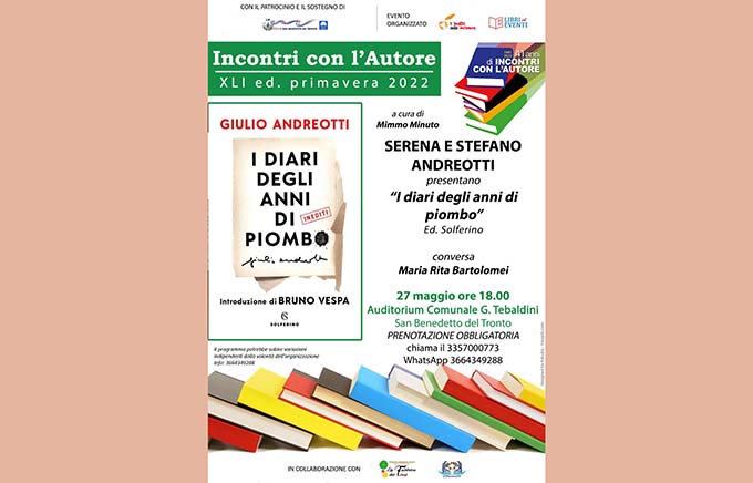 SAN BENEDETTO DEL TRONTO – Serena e Stefano Andreotti presentano il libro “I diari degli anni di piombo” di Giulio Andreotti, venerdì 27 maggio ore 18 all’Auditorium Comunale Tebaldini. Conversa con gli autori Maria Rita Bartolomei.