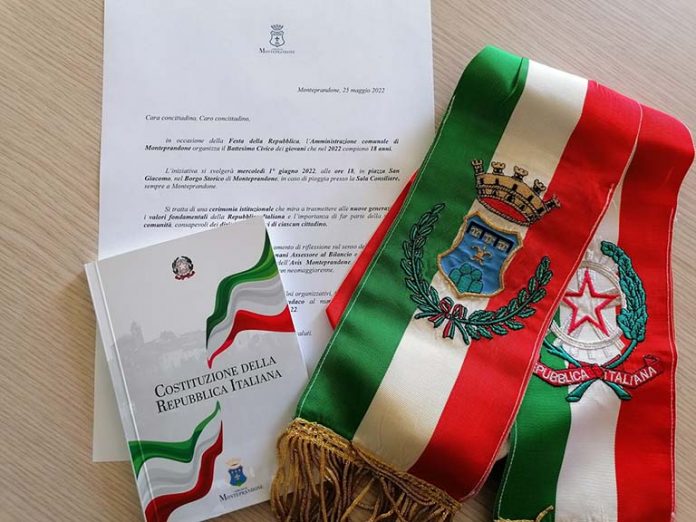 MONTEPRANDONE – In occasione della Festa della Repubblica, il Comune di Monteprandone organizza il “battesimo civico” dei diciottenni, una cerimonia istituzionale che ha l’obiettivo di trasmettere alle nuove generazioni i valori fondamentali della Costituzione italiana e l’importanza di far parte della comunità consapevoli dei diritti e dei doveri di essere cittadino. L’iniziativa quest’anno si svolgerà mercoledì 1° giugno, alle ore 18, in piazza San Giacomo, nel Borgo Storico di Monteprandone, alla presenza dei 129 giovani residenti a Monteprandone, nati nel 2004 che raggiungono la maggiore età nel 2022, e delle loro famiglie. Dopo i saluti del sindaco Sergio Loggi, ci sarà un momento di riflessione sul senso della ricorrenza del 2 giugno da parte dell’Avv. Meri Cossignani Assessore al Bilancio e l’intervento del dott. Alessandro Savino in rappresentanza dell’Avis Monteprandone. A seguire verrà consegnata una copia della Costituzione ai neo diciottenni. In caso di pioggia la manifestazione si terrà presso la sala consiliare a Monteprandone.