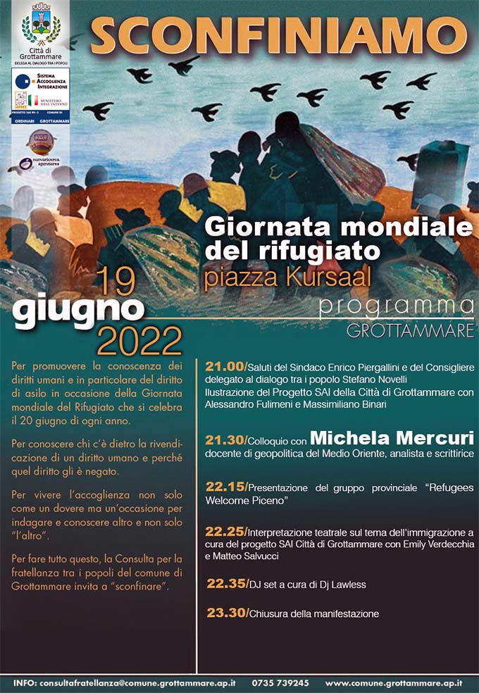 GROTTAMMARE – Tornano oggi, domenica 19 giugno, in piazza Kursaal gli eventi che introdurranno la Giornata mondiale del Rifugiato 2022, la ricorrenza indetta dalle Nazioni Unite nel 2001 che ogni 20 giugno ricorda all’opinione pubblica la condizione di milioni di rifugiati e richiedenti asilo nel mondo. Per l’occasione, dal 2010, la Città di Grottammare presenta “Sconfiniamo”, la manifestazione nata su impulso della Consulta per la fratellanza tra i popoli per illustrare le attività locali del progetto SAI “Together” – dal 2007 Grottammare è un nodo della rete di accoglienza ministeriale -, e invitare la comunità a guardare oltre i propri confini con approfondimenti su esperienze e fatti della storia contemporanea.
