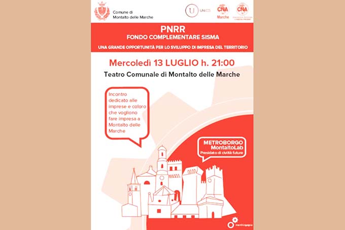 MONTALTO DELLE MARCHE – L’appuntamento è per domani, mercoledì 13 luglio, alle ore 21 presso il Teatro Comunale di Montalto delle Marche. L’argomento è la possibilità di fare impresa nel territorio cittadino. E l’invito è rivolto a coloro che hanno già un’attività, a chi vorrebbe potenziarla o a chi è interessato a metterla in piedi nel borgo pilota marchigiano vincitore del Piano Nazionale Borghi del Pnrr, con il progetto dal titolo “Metroborgo MontaltoLab – Presidato di Civiltà Future”. Sarà solo il primo di una serie di incontri rivolti alla popolazione montaltese e non, per coinvolgere il più possibile il territorio nel conoscere al massimo gli strumenti, i fondi e finanziamenti messi in campo dal “Pnrr complementare sisma” e da altre opportunità. «I fondi importanti del Pnrr Borghi e i cantieri progettuali che ci permetteranno di dare vita a tante nuove attività sono solo una parte di ciò che renderà Montalto il “Metroborgo” che sogniamo» dichiara il sindaco di Montalto delle Marche, Daniel Matricardi «L’iniziativa privata nel potenziamento e avvio di nuove attività d’impresa rappresenta un fattore fondamentale che vogliamo incoraggiare. Sappiamo bene quanto tecnicismi e burocrazia possano disincentivare l’imprenditorialità. Per questo la nostra amministrazione vuole accompagnare fin da subito chi intende investire a Montalto» conclude il sindaco. L’evento di domani sera è promosso dal Comune di Montalto delle Marche in collaborazione con Marchingegno, dalla società UNI.CO., dalla CNA Marche e dalla CNA territoriale di San Benedetto del Tronto.
