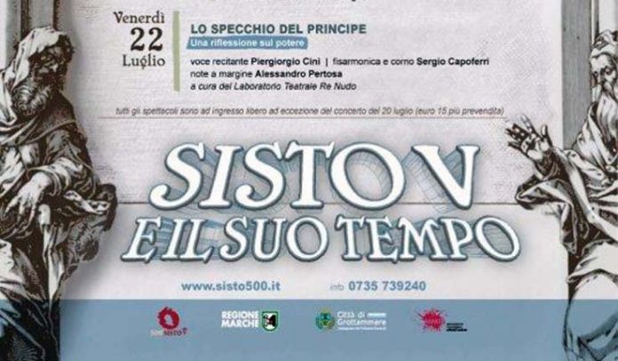 GROTTAMMARE – Riflessioni sul potere e sull’arte di governare per chiudere “Sisto V e il suo tempo. Un ponte verso la modernità”, la rassegna dedicata alle celebrazioni per i 500 anni dalla nascita del pontefice grottammarese Sisto V, avviata domenica scorsa. Oggi, venerdì 22 luglio, il Laboratorio Teatrale Re Nudo mette in scena “Lo specchio del principe, una riflessione sul potere”, spettacolo che è allo stesso tempo un viaggio che accompagnerà i presenti tra i testi di grandi pensatori, raffinati politici e brillanti letterati come Moro, Campanella, Machiavelli,  Guicciardini, Shakespeare tanto per citare alcuni degli autori a cui presterà la voce Piergiorgio Cinì, su musiche di Sergio Capoferri (corno e fisarmonica) e note a margine di Alessandro Pertosa (ParcoArena Sisto V, ore 21, ingresso libero).