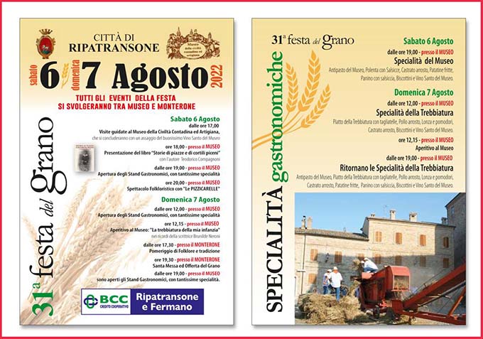 La partecipazione alla Festa del Grano sarà un’occasione per rivivere momenti importanti di lavoro ed impegno, che hanno posto le basi per lo sviluppo della comunità e ricordare le tante persone che hanno contribuito a questo. Sarà poi possibile visitare il Museo, accompagnati da guide esperte che saranno pronte a rispondere ad ogni curiosità. L’Associazione del Museo della Civiltà Contadina ed Artigiana, dal 1990 opera per custodire e mantenere vive le tradizioni della Città di Ripatransone. La realizzazione della festa è stata possibile grazie alla vicinanza ed al sostegno della Banca di Ripatransone