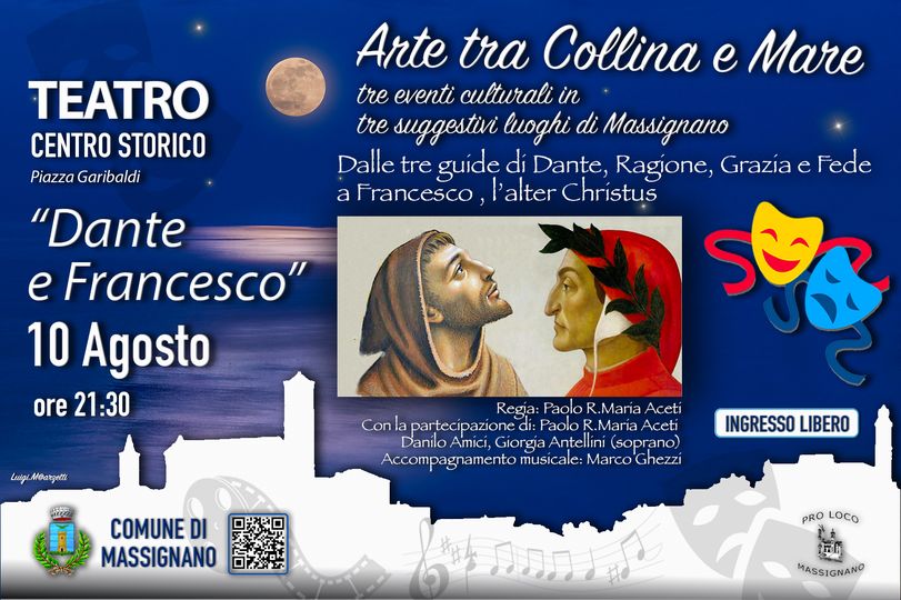 MASSIGNANO – Mercoledì 10 agosto alle ore 21.30 nel suggestivo centro storico di Massignano, con il Patrocinio del Comune e della Pro Loco, avrà luogo lo spettacolo Dante e Francesco – Dalle tre guide di Dante, tra Ragione, Grazia Divina e Fede a Francesco, l’alter Christus. Sarà il regista dello spettacolo Paolo R. Maria Aceti, lettore e commentatore della Divina Commedia di Dante Alighieri, a presentare la serata. L’evento prevede la partecipazione di Giorgia Antellini (soprano) e Danilo Amici (voce recitante). Francesco Aceti farà un cameo nel ruolo de “Lu santo Jullàre di Dio”, Antonio Angiolelli e Barbara Dall’Armellina sfileranno, rispettivamente nei ruoli di Pietro Di Bernardone e Pica di Bourlemont, in sontuosi abiti d’epoca. Accompagnamento musicale Marco Ghezzi. L’ingresso è libero. Lo spettacolo è la rivisitazione di Franciscus – Francesco “giullare di Dio” e le origini della letteratura italiana rappresentato ad Ascoli Piceno nel 2015 (cartellone 1215-2015 Cento anni Francesco ritorna ad Ascoli) a favore dei fini religiosi, caritatevoli e umanitari della Delegazione delle Marche Sud del Gran Priorato di Roma del Sovrano Militare Ordine di Malta.