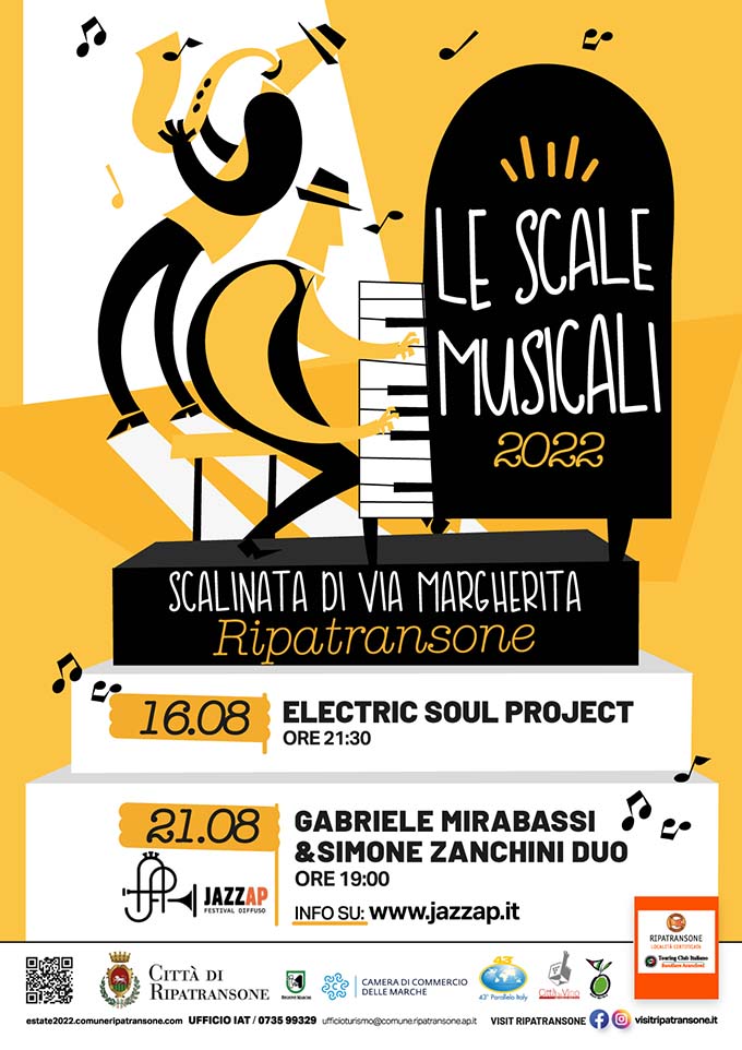 RIPATRANSONE – Il Centro Storico di Ripatransone e la sua Scalinata di Via Margherita tornano a fare da sfondo a “Le Scale Musicali”, la rassegna dedicata alla musica dal vivo in uno degli scenari più suggestivi del Belvedere del Piceno, in programma il 16 e il 21 agosto. Ad esibirsi nella prima serata sarà il collettivo Electric Soul Project (16 agosto – ore 21,30): un collettivo istrionico e multiforme che fonda il suo repertorio nelle varie sfaccettature della blackmusic: Funk/Soul/RnB, riproponendo brani di capiscuola del genere, tra i quali James Brown, Prince, Tower of Power, Chaka Khan, Stevie Wonder, Tina Turner, Alicia Keys, Bruno Mars e molti altri. Il secondo appuntamento della rassegna vedrà l’esibizione dei due grandi virtuosi nonché protagonisti della scena musicale internazionale Gabriele Mirabassi e Simone Zanchini in duo (21 agosto – ore 19), nell’ambito del Festival diffuso Jazzap (info su jazzap.it). Questi due musicisti portano in scena un incontro divertente, brillante, ricco di mille spunti e colori musicali: un dialogo avvincente tra il clarinetto e la fisarmonica che alterna atmosfere di sapore popolare ad altre colte, per raggiungere vette di puro lirismo. I concerti sono ad ingresso libero. Info su visitripatransone.it e sui canali social Visit Ripatransone (Facebook ed Instagram).