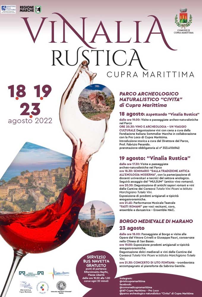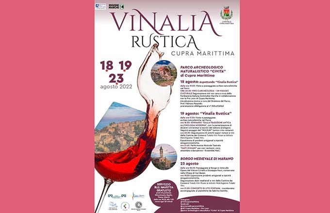 CUPRA MARITTIMA – Tre appuntamenti tra visite guidate, passeggiate naturalistiche, degustazioni, spettacoli. Giovedì 18 agosto con “Anteprima – Aspettando Vinalia Rustica”, alle ore 20,30 si terrà un viaggio culturale con la presentazione di vini, a cura della Pro Loco di Cupra Marittima. Il 19 agosto, alle ore 18.30 si terrà il seminario dal titolo “Dalla tradizione antica all’enologia moderna”, con la partecipazione di docenti universitari e tecnici del settore enologico. Seguirà l’assaggio dell’antico vino romano “Mulsum”. Dalle 20,30 degustazioni di antichi sapori romani e prodotti tipici del territorio con  vini delle cantine del consorzio Tutela Vini Piceni e Istituto Marchigiano Tutela Vini. La chiusura della serata sarà affidata alla performance musicale-teatrale “Fasti Romani”. Il 23 agosto sarà il Borgo Medioevale di Marano, la location per degustazioni, visite e passeggiate, esposizioni prodotti artigianali tipicità. Per l’occasione le cantine offriranno delle degustazioni, mentre la serata si concluderà con il concerto del famoso trombonista Lito Fontana, accompagnato al pianoforte da Sabrina Gentile. La manifestazione è realizzata grazie alla Regione Marche, con il patrocinio del Comune di Cupra Marittima, ideata dalla dott.ssa Maria Pia Spurio, docente presso l’Istituto Alberghiero di Ascoli Piceno e coordinata dall’Associazione Culturale Cuore Azzurro.