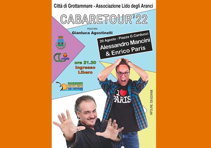 GROTTAMMARE – Sabato 20 agosto in Piazza Carducci va in scena l’ultimo appuntamento della fortunatissima rassegna comica Cabaretour organizzata dall’Associazione Lido Degli Aranci e dalla Città di Grottammare che fa da cornice al Festival di “Cabaret, Amore Mio!”. Dopo i successi con Alberto Caiazza e Andrea Fratellini, è la volta di due comici romani molto noti agli amanti del cabaret: Enrico Paris e Mago Alessandro Mancini. Il primo è stato vincitore di “Cabaret Amore Mio!” 2021 e porterà in scena il suo spettacolo di doppi sensi e giochi di parole che lo hanno portato in tv a Italia’s Got Talent nel 2022. Enrico si definisce “giovane italo-romano dalla doppia personalità: chimico di giorno e comico di notte”. Il secondo, Mago Mancini, da più di 25 anni opera nel settore dello spettacolo come prestigiatore, attore, comico, presentatore e autore teatrale. Da quattordici anni è il direttore artistico del Teatro “Makkekomiko”, insieme ai suoi due soci gestisce l’Accento Teatro di Roma e ogni anno fornisce al festival grottammarese tanti comici per il concorso. Presenta la serata Gianluca Agostinelli che delizierà anche i bambini con i mitici versi e rumori degli animali e del loro mondo. L’ingresso è libero. Prossimo appuntamento per l’Associazione Lido degli Aranci, sabato 27 agosto in Piazza Fazzini con l’ultimo appuntamento estivo anche della Rassegna “Notti Magiche” che vedrà come ospiti Frate Mago e Mago Salem a chiusura di questi appuntamenti estivi 2022. Info: 335.6234568 e sui canali social Fb ed Instagram “Associazione Lido degli Aranci Official”.