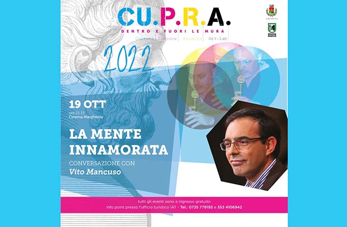 GROTTAMMARE – Mercoledì 19 ottobre alle ore 21.15 presso il Cinema Margherita di Cupra Marittima, il filosofo e teologo Vito Mancuso sarà ospite dell’ultimo appuntamento del festival “Cupra Dentro e Fuori le Mura”. La conversazione ruoterà intorno al suo ultimo libro intitolato “La mente innamorata”. In questa nuova tappa del suo percorso filosofico, Mancuso sostiene che l’equilibrio tra l’irrazionalità dell’amore e la pura logica della mente è ancora possibile: per dimostrarlo chiama a raccolta le vite e le esperienze di grandi del presente e del passato – da Dante a Hannah Arendt, da Giordano Bruno a Etty Hillesum – in un ideale pantheon di menti innamorate capaci di conquistare quella grazia che è il frutto più bello di ogni educazione spirituale. A partire dal loro luminoso esempio, l’autore indica la strada da percorrere per dare ascolto al maestro interiore che ognuno custodisce dentro di sé, e raggiungere uno stato di felicità dell’esistenza puro e allo stesso tempo reale, sognante ma a occhi aperti, che rappresenta il dono maggiore che si possa ricevere dalla vita. Il festival è sostenuto e promosso dall’Amministrazione Comunale di Cupra e dalla Regione Marche. Ingresso libero fino a esaurimento posti.