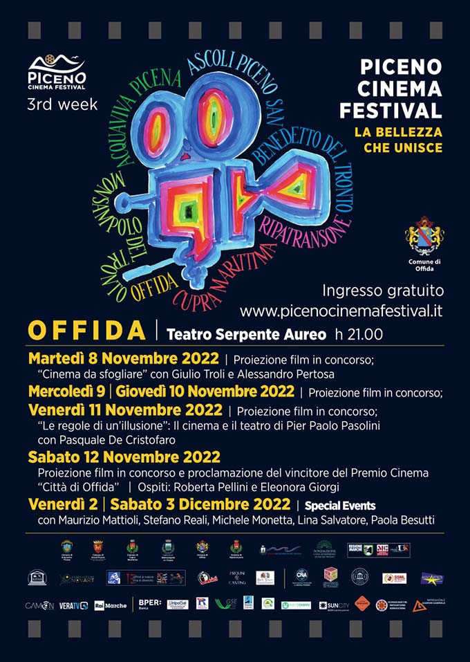 «Mettiamo al centro di questo festival le nuove generazioni e porteremo i personaggi nelle scuole a parlare di cinema che significa parlare di cultura» aggiunge Roberto Armiento. Non solo proiezioni in questa settimana offidana, ma anche numerose iniziative parallele. Martedì 8 novembre è in programma lo spettacolo: Cinema da sfogliare, con lo sceneggiatore Giulio Troli e il drammaturgo Alessandro Pertosa. Venerdì 11 novembre l’appuntamento con Ciak, in scena: “Le regole di un’illusione”- Il cinema e il teatro di Pier Paolo Pasolini, con il regista Pasquale De Cristofaro. Sabato 12 novembre, serata finale con la proclamazione del film vincitore. Ospiti Eleonora Giorgi, star del cinema italiano – che in mattinata incontrerà una delegazione di alunni al Teatro Serpente Aureo – e la regina del doppiaggio Roberta Pellini.