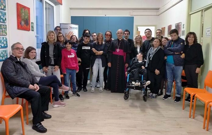 SAN BENEDETTO DEL TRONTO – Venerdì 4 novembre il Vescovo Mons.Carlo Bresciani, accompagnato da don Romualdo Scarponi, si è recato nella sede di via Manzoni dell’Associazione XMano Odv Genitori Uniti per la Disabilità, in occasione della visita pastorale nelle varie parrocchie della città. I ragazzi di XMano lo hanno accolto simpaticamente, mentre il presidente Toni Ciabattoni e i genitori presenti hanno illustrato le varie attività educative e ricreative che l’Associazione propone nei pomeriggi della settimana. Quest’anno l’apertura del Centro è dal lunedì al venerdì dalle ore 15,30 alle 18. Le attività svolte sono la musicoterapia, il laboratorio teatrale, attività motoria, il laboratorio musicale della XManorkestra, attività rivolte all’autonomia e laboratori artistici. Il Vescovo Bresciani si è mostrato molto interessato e partecipe, interagendo con i ragazzi per la merenda. Mostrato anche il trailer del lungometraggio “State buoni se potete” di prossima uscita, film che vede coinvolti tutti i ragazzi dell’Associazione insieme ad attori di compagnie teatrali del territorio. Il Vescovo si è persino prestato al saluto giocoso e rituale dei ragazzi a conclusione delle attività. L’incontro è terminato con una preghiera seguita dalla benedizione per tutti i presenti.