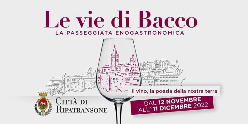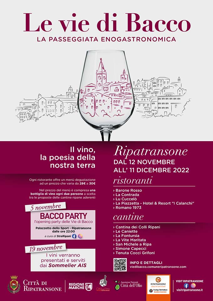 RIPATRANSONE – Con l’autunno Ripatransone torna ad essere percorsa sulle Vie di Bacco. Prende il via dal 12 novembre e fino all’11 dicembre 2022 la storica iniziativa di valorizzazione delle eccellenze enogastronomiche ripane e picene proposte dai Ristoratori e dalle Cantine Vitivinicole della Città promossa dall’Amministrazione Comunale di Ripatransone. La manifestazione, giunta alla sua 27ª edizione, vede per il 2022 un ampio coinvolgimento delle realtà cittadine e sarà vetrina dei migliori prodotti del territorio.La formula prevede la proposta di menù degustazione ad un prezzo compreso tra 28 euro e 30 euro a persona; tali menù includono una bottiglia di vino ogni due persone tra le proposte delle Cantine Ripane aderenti. Le etichette saranno quindi contenute in una vera e propria Carta dei Vini Ripani. In ciascun menù verrà proposto un piatto tipico del patrimonio gastronomico ripano o piceno. L’edizione 2022 vede la partnership con i Sommelier di Ais che presenteranno e serviranno i vini della carta agli ospiti dei ristoranti nella serata di sabato 19 novembre.