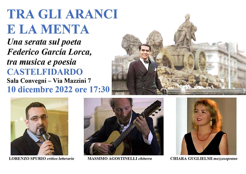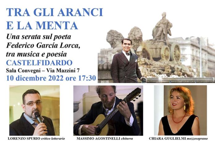 CASTELFIDARDO – Sabato 10 dicembre a partire dalle ore 17.30, presso la Sala Convegni a Castelfidardo (Via Mazzini n.7), si terrà l’evento “Tra gli aranci e la menta”, una serata interamente dedicata al poeta e drammaturgo spagnolo Federico García Lorca (1898-1936), il poeta “con il fuoco nelle mani” che trovò la morte, giovanissimo, nell’agosto del 1936 agli albori del conflitto civile che avrebbe imperversato in Spagna dal 1936 al 1939 e che avrebbe gettato il paese in una delle dittature più spietate e lunghe dell’intera storia contemporanea, il franchismo. Organizzata dall’Associazione Cultura Euterpe APS di Jesi (AN) con la collaborazione e il patrocinio del Comune di Castelfidardo (Ancona) che ha inserito l’evento all’interno del ricco contenitore di iniziative per il Natale 2022, la serata vedrà alternarsi un connubio di poesia e musica grazie alla presenza di professionisti di pregiata caratura che si dedicheranno agli interventi musicali.