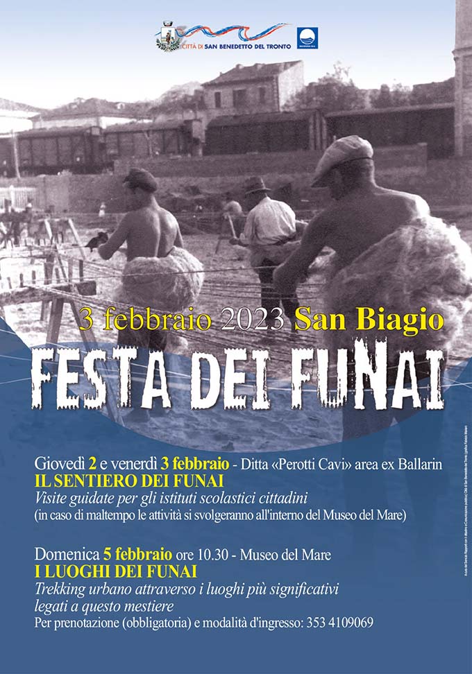 SAN BENEDETTO DEL TRONTO – In occasione della Giorno di San Biagio, il 3 febbraio, torna a San Benedetto la tradizionale “Festa dei Funai”. La ricorrenza, istituzionalizzata nel 2007 dall’Amministrazione comunale, trae origine dalla festa organizzata il 3 febbraio 1911 da don Francesco Sciocchetti, allora parroco della chiesa di Santa Maria della Marina, in occasione dell’elevazione di un altare a San Biagio, protettore dei cardatori. Prese così piede la tradizione della messa e della colazione offerta ai funai, ai canapini e alle loro famiglie, che si estese poi anche nelle parrocchie vicine del Paese Alto e di San Giuseppe. Come è consuetudine, giovedì 2 e venerdì 3 febbraio la ditta “Perotti Cavi” aprirà le porte agli alunni delle scuole del territorio che, guidati dal personale del Museo del Mare, potranno visitare lo stabilimento ed esplorare il “Sentiero dei funai”. Inoltre domenica 5 febbraio, alle 10:30, il Museo del Mare organizzerà una passeggiata per le vie cittadine dal titolo “I luoghi dei funai”, un’escursione di trekking urbano che attraverserà i luoghi legati alla storia e al mestiere dei funai. La partecipazione alla passeggiata ha un costo di 5 euro e richiede la prenotazione, effettuabile chiamando il numero di telefono 353 4109069.