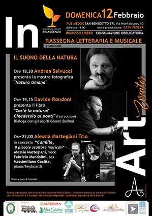 SAN BENEDETTO DEL TRONTO – Continua la V edizione di “In Art”, la rassegna letteraria e musicale a cura dell’associazione culturale Rinascenza, con la direzione artistica di Annalisa Frontalini, manifestazione che quest’anno si articola in “In Art Teatro” e “In Art Winter”. Domenica 12 febbraio al Pub Medoc di San Benedetto è in programma il terzo appuntamento di In Art Winter, intitolato “Il suono della natura”, con Andrea Salvucci, Davide Rondoni e Alessia Martegiani Trio. Alle ore 18.30 Andrea Salvucci presenterà la mostra fotografica “Natura Umana”; alle 19.15 Davide Rondoni presenterà il libro “Cos’è la natura? Chiedetelo ai poeti” (Fazi Edizioni). Dialogherà con gli ospiti Gianni Balloni. Alle ore 22, con “Camille, 8 piccole sculture musicali”, ci sarà in concerto Alessia Martegiani Trio, composto da Alessia Martegiani (voce), Fabrizio Mandolini (sax) e Massimliano Coclite (piano/keyboards).