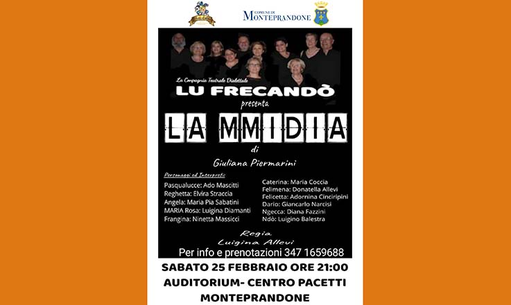 MONTEPRANDONE – Sabato 25 febbraio si terrà il terzo appuntamento della rassegna teatrale “Monteprandone in scena”. A salire sul palco del Centro Pacetti di Monteprandone sarà la compagnia teatrale dialettale “Lu frecandò” con la commedia dialettale “La Mmidia” di Giuliana Piermarini per la regia di Luigina Allevi, spettacolo a cura dell’associazione culturale teatrale “Nuovo sipario aperto” di Pagliare del Tronto.