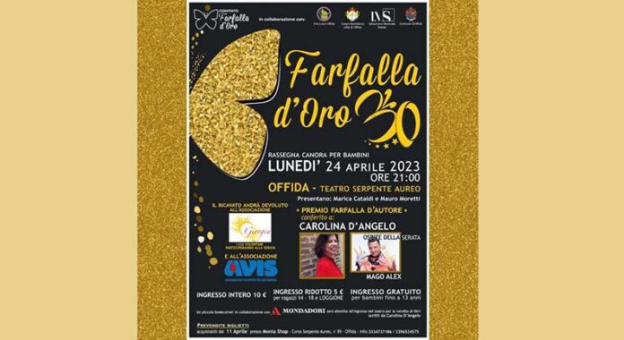 OFFIDA – Tutto pronto per l’edizione 2023 della “Farfalla d’Oro”, la rassegna canora per bambini, che si svolgerà il 24 aprile, dalle ore 21, al Teatro Serpente Aureo. L’evento, giunto alla 30esima edizione, è stato organizzato dal Comitato “La Farfalla d’Oro”, presieduto da Sabina Premici in collaborazione con l’Amministrazione comunale di Offida, la Pro Loco, l’Istituto Musicale “Giuseppe Sieber” e il Corpo Bandistico “Città di Offida”. Il coro della Farfalla d’Oro, diretto da Monica Longo, sarà composto da Anna Lupi, Matteo Iezzi, Maria Cristina Marchei, Noemi Monne, Nicole Monne, Maya Marcantonio, Valentina D’Angelo, Chiara Vallorani, Gioia Impedovo, Massimo Citeroni, Gioele Scipioni, Chiara Cocci, Stefano Maria Lupi, Valerio Laudadio, Giorgia Peroni. I vocalist saranno Andrea Marinelli, Antonella Ciabattoni, Gaia Mozzoni e Camilla Maroni.