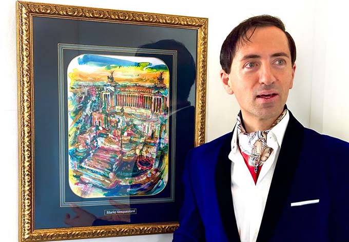 ROMA – Si è tenuta nella giornata di mercoledi 12 aprile presso la sede del Gruppo Medaglie d’Oro al Valor Militare, la celebrazione dei cento anni della sua costituzione. Un evento storico e di grande commozione che ha visto la presenza del Presidente della Repubblica Sergio Mattarella. Al Capo dello Stato è stato fatto dono di un pregevole dipinto di Mario Vespasiani, giovane maestro che si è sempre distinto per le sue qualità artistiche e umane, per l’attaccamento a quei valori fondamentali di identità e di unità. L’opera raffigura la veduta aerea dell’Altare della Patria, un monumento caro all’artista in quanto durante il bombardamento di San Lorenzo, il nonno di cui porta il nome, era proprio di guardia al Milite Ignoto. Il dipinto riassume tutta l’estetica di Vespasiani, che in quelle pennellate vibranti ha saputo far risuonare passione e sentimento, energia e partecipazione. Ma sono i colori, quel virtuoso abbinamento cromatico a rendere le opere dell’artista inconfondibili e questa sua abilità non è sfuggita al Presidente della Repubblica che ha dichiarato di fronte al dipinto di Vespasiani: «Straordinario l’uso dei colori».