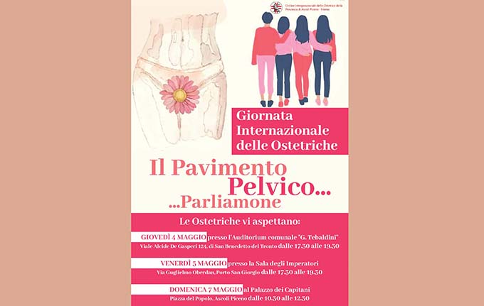 Le ostetriche invitano a partecipare tutte le donne di ogni fascia in una delle tre giornate informative “Il pavimento pelvico…parliamone” che si terranno: il 4 maggio a San Benedetto del Tronto (Auditorium Comunale Tebaldini) , il 5 maggio a Porto San Giorgio (Sala degli Imperatori), il 7 maggio ad Ascoli Piceno (Palazzo dei Capitani).