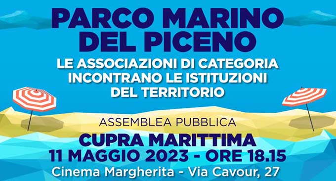 CUPRA MARITTIMA – Con il patrocinio dell’Amministrazione comunale di Cupra Marittima si terrà, giovedì 11 maggio alle ore 18.15, al Cinema Margherita, un tavolo di confronto tra Istituzioni e operatori della pesca e balneazione per parlare del “Parco Marino del Piceno”. All’assemblea pubblica interverranno il sindaco di Cupra Alessio Piersimoni, il presidente del consorzio CO.VO.PI Gerardo Fragoletti; il presidente di “Cupramare Balneari” Pietro Aureli, il presidente di CO.GE.VA Giovanni Di Mattia e il consigliere comunale di San Benedetto del Tronto Lorenzo Marinangeli. All’evento parteciperà anche l’Assessore regionale alle Attività produttive Andrea Maria Antonini.