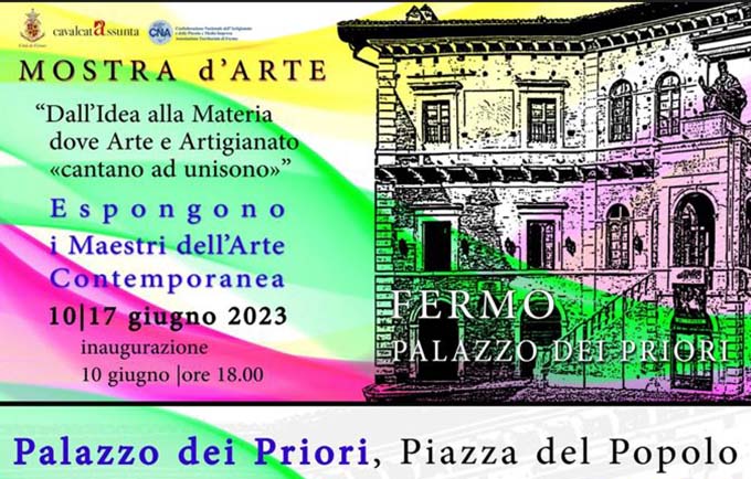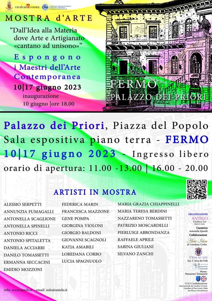 FERMO – L’arte contemporanea e l’alto artigianato dialoghino per costruire un nuovo comune linguaggio, questo è il fine della mostra “Dall’Idea alla Materia dove l’Arte e Artigianato cantano ad unisono” presso il Palazzo dei Priori di Fermo, visitabile dal 10 al 17 giugno 2023, orario di apertura 11.00-13.00/16.00-20.00. L’evento è ideazione della curatrice M° Antonella Spinelli, Responsabile del settore Mostre della società Antelo Faschion Art made in Italy in collaborazione con Loredana Corbo. Partecipano all’organizzazione il Museo Nazzareno Tomassetti e Associazione Culturale L’Arca dei Folli – Commenda dei Cavalieri del CiKP di Sant’Emidio KPR Aretha. L’inaugurazione della mostra avrà luogo sabato 10 giugno alle ore 18, alla presenza degli artisti e rappresentanti delle autorità amministrative, Associazioni ed Enti Patrocinatori dell’evento: Città di Fermo, A. C. Cavalcata dell’Assunta, CNA Confederazione Artigianato Nazionale, CiKP Confederazione Internazionale dei Cavalieri di Pace di Malta, Assisi, San Bruno, Gerusalemme.