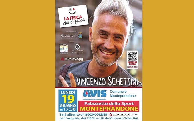 MONTEPRANDONE – Ospite d’eccezione al Palazzetto dello Sport di Monteprandone, lunedi 19 giugno alle ore 17.30; il “Prof più social d’Italia”, Vincenzo Schettini, incontrerà i suoi fan a suon di lezioni di fisica e non solo. Già, perché gli organizzatori di questo evento, sono i volontari Avis di Monteprandone, che hanno pensato di arrivare al cuore dei giovani tramite uno che con i giovani ci sa fare, conosce il loro linguaggio, conosce i loro limiti e i loro punti di forza, sa motivarli e sa trasmettere loro valori morali e sani principi. Ma l’eclettico Professore ci sa fare anche con gli adulti, con i genitori e soprattutto con i suoi colleghi docenti ai quali chiede di essere “creativi” e di catturare l’attenzione degli studenti, applicando dei concetti astratti alla vita di tutti i giorni.