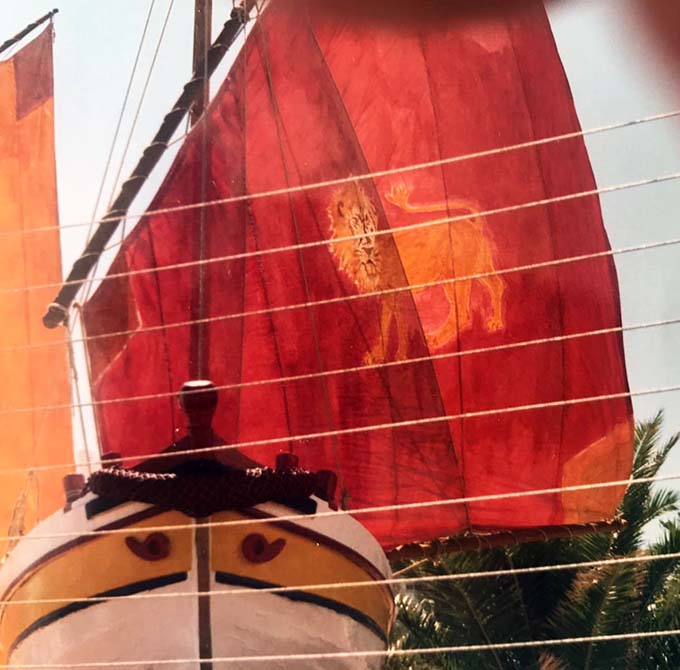 Aveva una rudimentale vela a trapezio-quasi-triangolo detta “al terzo” (1/3 della vela sporgente oltre l’albero verso prua) con boma, colorata e con disegni facili facili. Niente motore (neanche i pedali, infatti nessuno la chiamava Graziella). Sulla grezza vela, continuamente bagnata con acqua di mare per irrobustirne la trama, l’importante era l’immagine – il Torrione, il gallo, l’ancora, Gesù, una stella marina, un gabbiano, una sirenetta… – oppure il simbolo del soprannome della famiglia proprietaria: siccome il padrone della Pupina lo si chiamava LIO’, Marcello Sgattoni gli dipinse un leone sulla vela rossastra.