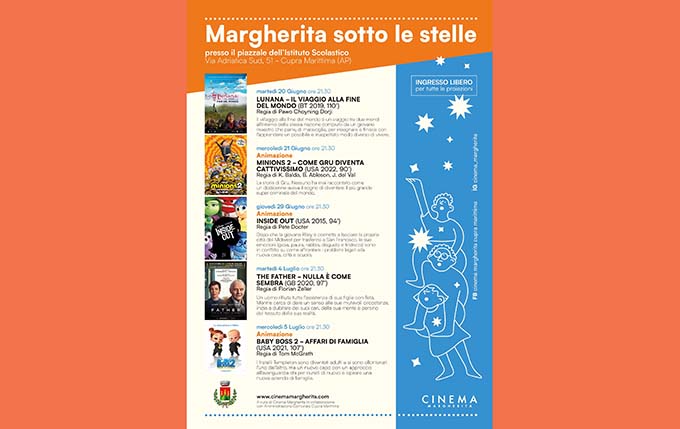 CUPRA MARITTIMA – Ci sono film che vanno visti e rivisti anche dopo anni dall’uscita nelle sale, film che apprezziamo con il tempo che passa, opere che rendono il cinema l’arte più amata al mondo, che non si spengono dopo una stagione, ecco, di queste opere cinematografiche è composta la rassegna di cinema all’aperto “Margherita sotto le stelle”. Cinque appuntamenti da vivere in comunità illuminati dal grande schermo. Si inizia martedì 20 giugno con “Lunana”, il villaggio ai confini del mondo, dove una comunità vive a contatto con la natura e con i valori fondamentali, mercoledì 21 giugno spazio al grande successo di “Minions 2”. Si prosegue giovedì 29 giugno con un capolavoro della Pixar, che è un viaggio nel nostro inconscio, “Inside out”, film di animazione capace di interessare i bimbi di 3 anni agli appassionati di psiche fino ai 90…. Lunedì 4 luglio “The father”, un capolavoro di cinema, recitazione ma soprattutto un rapporto tra padre malato di Alzheimer sua figlia. Le proiezioni avranno luogo presso il piazzale dell’ Istituto Scolastico Scuole Medie in via Adriatica Sud, 51 – Cupra Marittima. L’iniziativa è a cura del Cinema Margherita in collaborazione con l’Amministrazione comunale di Cupra Marittima.