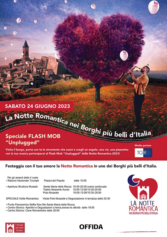 OFFIDA – Il 24 giugno torna a Offida l’appuntamento con La Notte Romantica nei Borghi più Belli d’Italia. «Un’occasione per ammirare le bellezze architettoniche e artistiche del borgo – commenta l’assessore Cristina Capriotti – Una passeggiata per le vie del centro storico, con degustazioni a tema, aperitivi e cene romantiche, Offida vi aspetta per trascorrere una giornata all’insegna dell’amore». In programma una visita al Polo Museale con degustazione in terrazza dalle 20.30; il Selfie Kiss Me a Santa Maria della Rocca; dalle ore 18 Aperitivi e Degustazioni a tema al centro storico e dalle ore 20 previste cene romantiche nelle attività che aderiscono all’iniziativa. Per l’occasione sarà prevista l’apertura delle strutture museali nei seguenti orari: Santa Maria della Rocca 10-20 orario continuato; Teatro Serpente Aureo, 10-13/15:30-20; Polo Museale 10-13/15:30-20. Inoltre, per gli amanti delle 4 ruote, nella mattinata del 24 giugno, dalle ore 10, si terrà il Raduno Nazionale Triumph. Il 24 giugno, il sabato successivo al solstizio d’estate, com’è consuetudine da ormai otto anni I Borghi più belli d’Italia diventeranno i protagonisti di una serata indimenticabile, dedicata a tutti gli innamorati: La Notte Romantica nei Borghi più belli d’Italia. Già dal primo anno, nel 2015, La Notte Romantica si è rivelata uno degli eventi più interessanti del panorama di manifestazioni turistico-culturali e di intrattenimento del nostro Paese, con grandi consensi e partecipazione di pubblico, con ogni anno una media di 500.000 visitatori nei borghi della rete che organizzano l’evento. Anche quest’anno si registra una grande adesione e partecipazione da parte dei comuni: saranno infatti più di 220 i borghi che fanno parte dell’Associazione che organizzeranno questa magica serata.