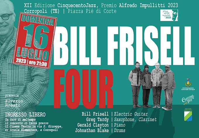 CORROPOLI – Domenica 16 luglio alle ore 21.30, nella splendida cornice di Piazza Pié di Corte a Corropoli, il CinquecentoJazz, con il patrocinio e il supporto del Comune e della Regione Abruzzo, organizza il concerto per il Premio Alfredo Impullitti 2023, XII Edizione del CinquecentoJazz Festival. Per l’occasione si esibirà Bill Frisell con il progetto Four, insieme al suo quartetto. Nel corso dell’evento, il M° Frisell riceverà il premio Alfredo Impullitti 2023 “alla carriera”. A presentare la serata – ad ingresso libero e gratuito – sarà Elvezio Rosati. In caso di maltempo il concerto si terrà presso il Cinema Teatro in via San Giuseppe, ex Scuola Elementare nel Centro Storico di Corropoli. Info: 349 625 048.