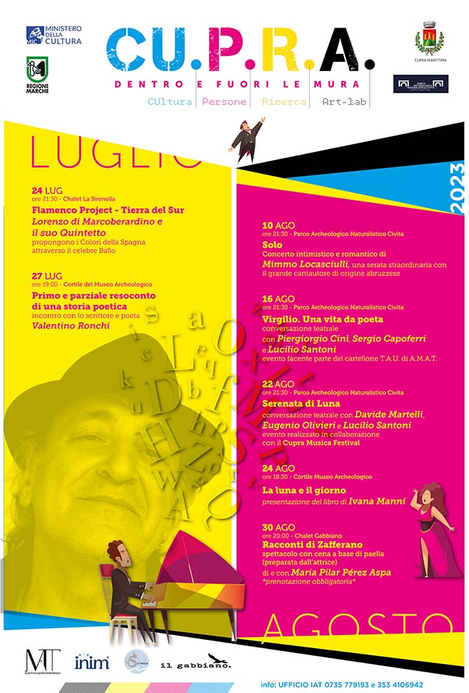 CUPRA MARITTIMA – Per il terzo anno consecutivo, nell’occasione degli eventi estivi, l’Amministrazione comunale di Cupra Marittima conferma la volontà di investire risorse nella formazione culturale delle persone, intesa come condivisione di immaginari, di sguardi su micro e macrocosmo, intrecci di storie collettive e destini individuali. «Rifletteremo sul passaggio, mai indolore, tra tradizione e modernità, culture originarie e miti del progresso. – spiegano gli organizzatori – La rappresentazione di sé e dell’altro; nonché l’intreccio fra memorie consolidate e identità mutanti. Il festival crea percorsi di senso che ci interpellano e ci affascinano, sviluppando intersezioni con musica, teatro, letteratura e laboratori. Intendiamo continuare a realizzare chiavi di interpretazione del contemporaneo, che si pongono come cerniere tra le culture. Una forma d’incontro mediterranea, fonte di conoscenza. Il tutto avrà come prerogativa essenziale il “divertirsi pensando” ovvero il “pensare divertendosi”, che è metodo privilegiato per una formazione culturale solida e feconda».